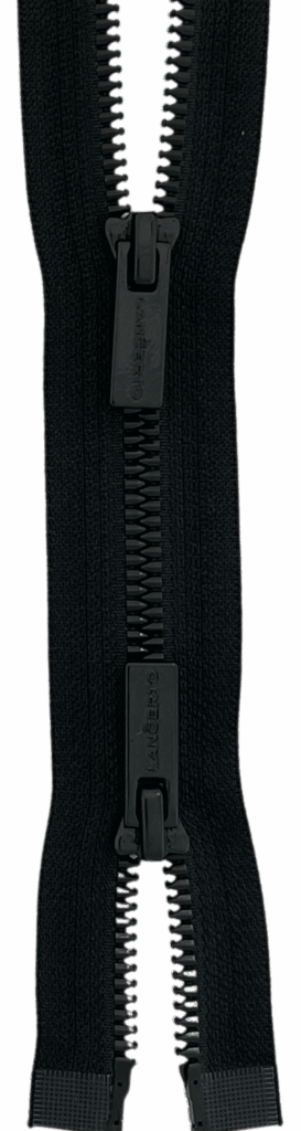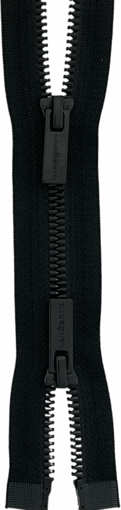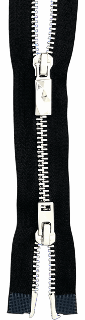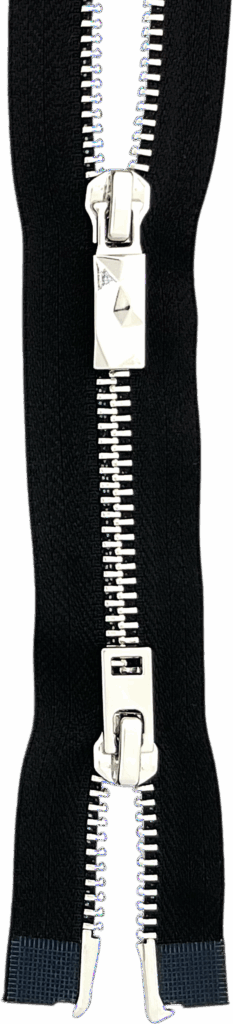 A metal zipper with black oxidized teeth, glossy finish on the teeth, slider, and pullers. The two-way separating zipper is convenient for use in longer jackets, parkas, and sweatshirts, as it allows for unzipping from the bottom.