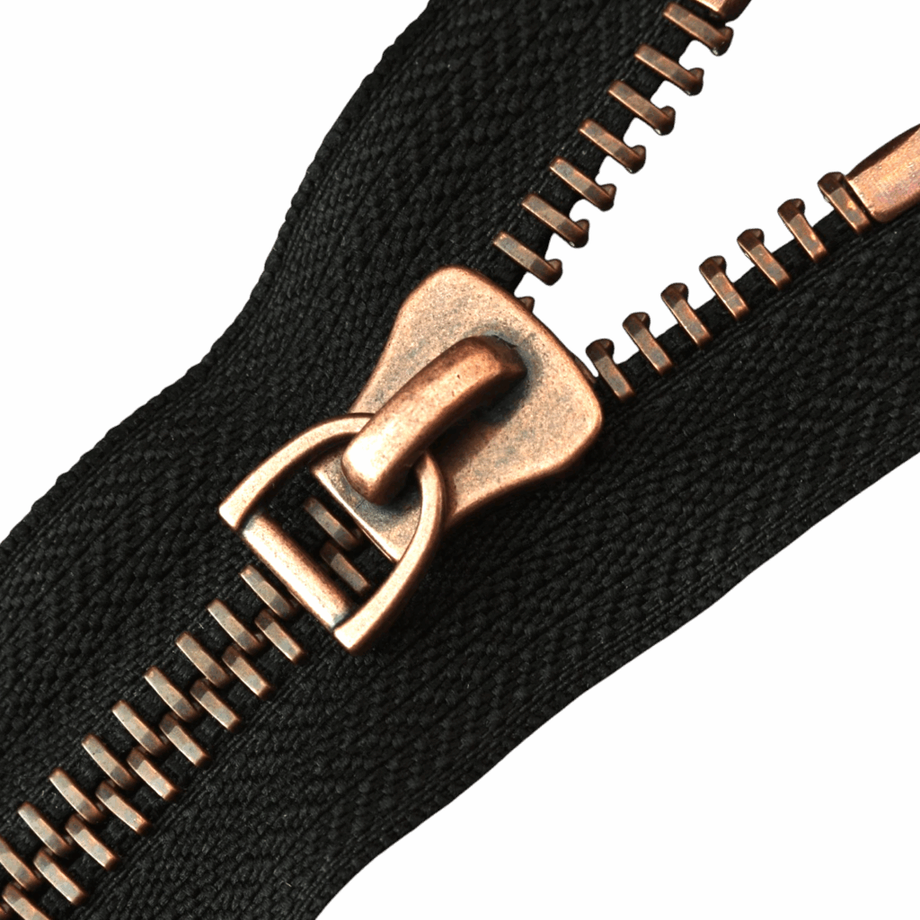 We offer a wide range of premium finishes and colors to match your design aesthetic. Available options include polished teeth in antique copper for a warm, vintage look, antique silver with standard Y-type teeth for a classic appearance, light antique brass color for traditional styling, and black oxide finishes for modern, sleek designs. Each finish is carefully applied to ensure consistent quality and appearance. These various finishes allow metal zippers to complement different hardware such as rivets, snaps, and buckles, creating a cohesive and professional overall design.